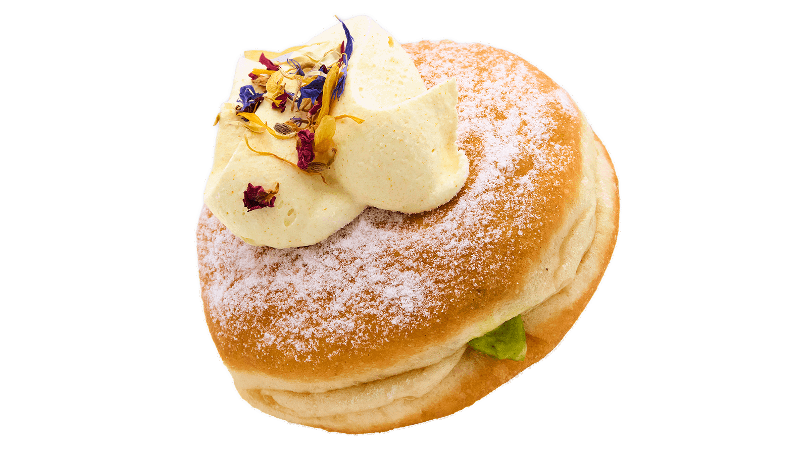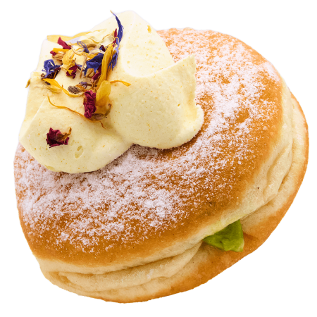 This flavour was requested by so many of you, and its floral notes are perfect for spring: a simple ring donut dipped in hibiscus glaze and decorated with dried flowers.