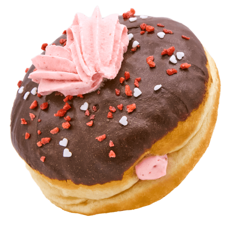 Fruity, chocolatey, and full of Valentine’s vibes. This filled donut hides an airy strawberry cream (whip, strawberry, vanilla custard) inside, is coated in Original Beans chocolate ganache, and topped with heart sprinkles, freeze-dried strawberries, and a soft strawberry whip heart.