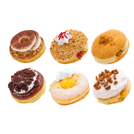Our seasonal special donuts. This box includes: Tiramisu, Frankfurter Kranz, Biscoff Bomboloni, Maulwurfkuchen, Tarte au Citron and Apple Walnut