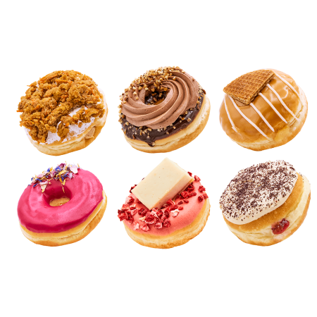 Our seasonal special donuts. This box includes: Apple Stroopwafel, Pink Hibiscus, Hazelnut Praline, Carrot Cake, Strawberry NY Cheesecake and Germknödel