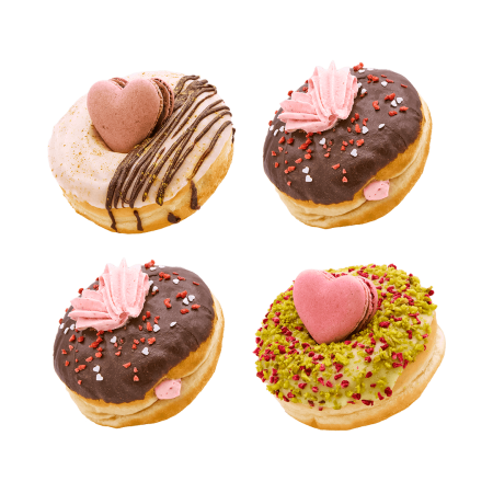 Share the love — or keep it all to yourself. Our limited Valentine’s Box brings together four dreamy donuts made for the sweetest day of the year. Inside you’ll find one Double Choc Macaron, one Pistachio Raspberry Macaron, and two Choc Strawberry Cloud donuts. Think chocolate, fruity berry notes, nutty pistachio, and vegan Macarons — all handmade, all vegan, and all dressed up for Valentine’s Day.