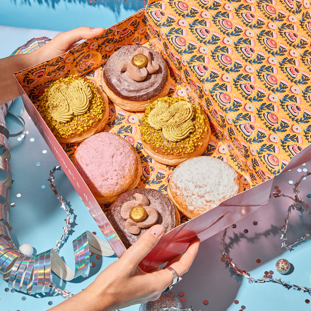 Dieses Jahr haben wir uns was ganz Besonderes für die Feiertage ausgedacht! 🎁 Unsere exklusive Festive Box ist nur auf Vorbestellung und ausschließlich für den 24. Dezember erhältlich. Darin findest du sechs Special Donuts: 1x Biscoff Bomboloni, 1x Chocolate Snow Flake, 1x Cinnamon Almond Creme Brulee, 1x Vanilla Raspberry Bear, 1x Moose au Chocolat (Orange curd filled), 1x Pistachio Vanillekipferl. Nur in limitierter Anzahl erhältlich.