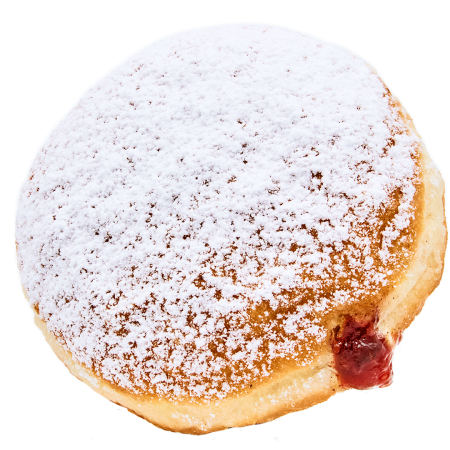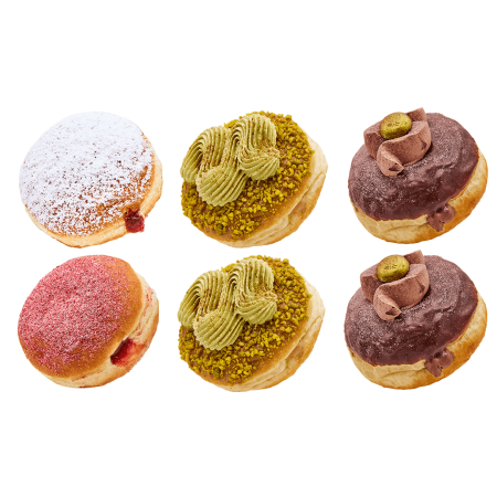Für die größere Silvesterparty: Du bekommst einen klassischen Pfannkuchen mit Pflaumenfüllung, einen Erdbeer-Pfannkuchen, zwei Chocolate Mousse Donuts und zwei Nougat Pistachio Donuts.