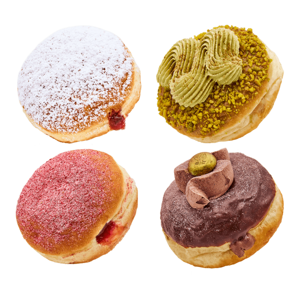 Die beste Mischung für deine Silvesterparty: Fruchtig, nussig und schokoladig. Diese Box enthält unsere klassischen Berliner Pfannkuchen mit Pflaumen- und Erdbeerfüllung, einen festlichen Chocolate Mousse Donut (mit Goldstaub) und einen köstlichen Nougat Pistachio Donut.