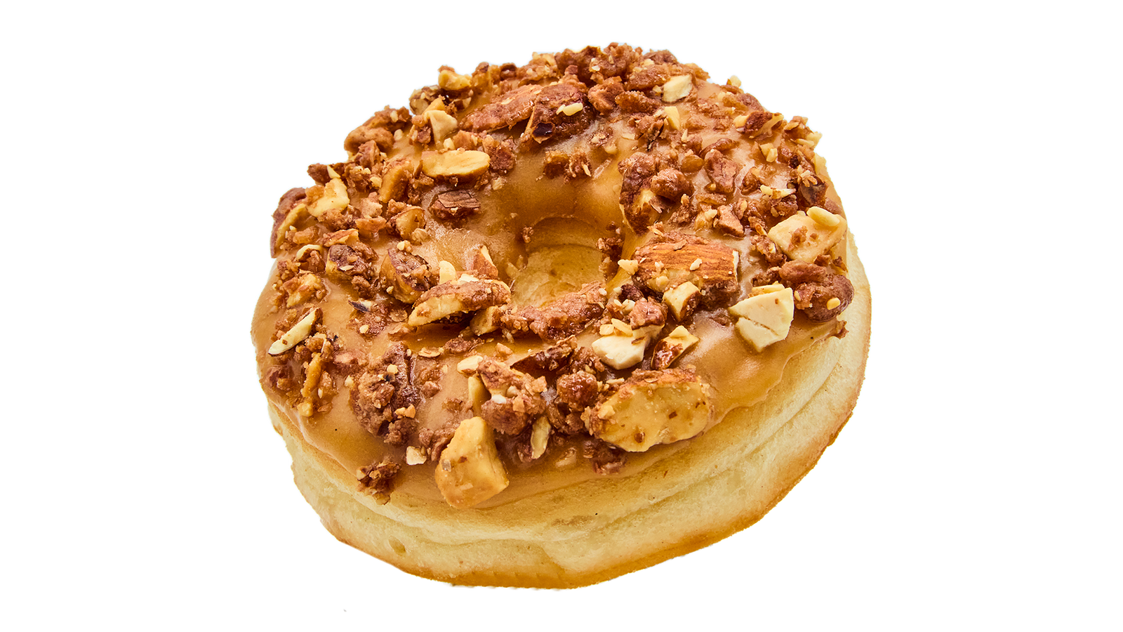 Wie ein Weihnachtsmarkt in Donutform. Ein fluffiger Ring-Donut, glasiert mit Karamell und getoppt mit knusprigen gebrannten Mandeln. Süß, nussig und das Beste am Winter.