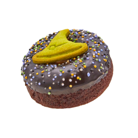 Dunkel, magisch und gefährlich lecker. Ein Schoko-Cake-Donut, überzogen mit schwarzer Original Beans Ganache, Halloween-Sprinkles und einem knackigen Hexenhut.. Im Kern versteckt sich ein cremiger Karamell-Erdnuss-Pudding.