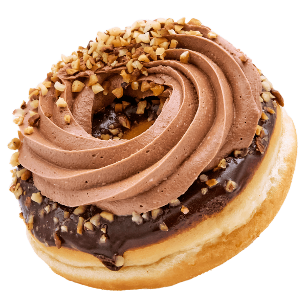 Dieser fluffige Donut wird in dunkle Original Beans Ganache getaucht und für den perfekten Crunch mit gerösteten, gehackten Haselnüssen überzogen. Das Highlight ist die Creme on top: ein Mix aus Schokolade, Haselnuss, Cream Cheese und Sahne.