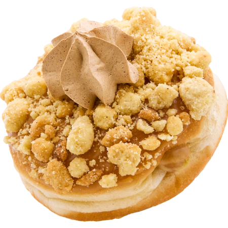 Ein Apfel-Donut darf natürlich auch im April nicht fehlen. Diese Version ist mit cremigem Apfel-Karamell-Pudding gefüllt, mit Karamell überzogen und wird mit knusprigen Streuseln und einem Tupfer Karamell-Sahne getoppt.