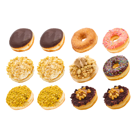 Diese Box ist perfekt für alle, die eine Auswahl an Geschmacksrichtungen für eine größere Party möchten und sich nicht entscheiden wollen. Sie enthält unsere Allzeitfavoriten: 2x Boston Cream, 2x Bienenstich, 2x Brownie Caramel Peanut, 2x Pistachio Dream, 1x Apple Caramel, 1x Strawberry Sprinkles, 1x Cinnamon Sugar, and 1x Choc Sprinkles