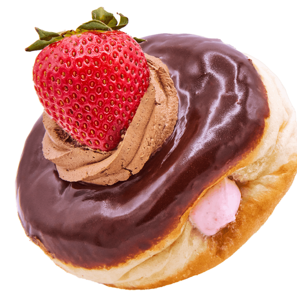 Dieses Weekend Special ist mit fluffiger Erdbeer-Cream-Cheese-Creme gefüllt, mit Original Beans Schokolade überzogen und mit einem Klecks Schoko-Sahne und einer frischen Erdbeere getoppt. Eine go-to Geschmackskombination und perfekt für das lange Wochenende.