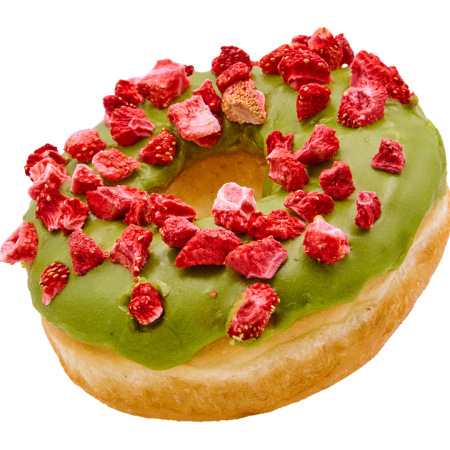 Ein bisschen erdig, ein bisschen fruchtig und sehr cute. Dieser luftige Donut ist mit leuchtender Matcha-Glasur überzogen und mit gefriergetrockneten Erdbeeren veredelt.
