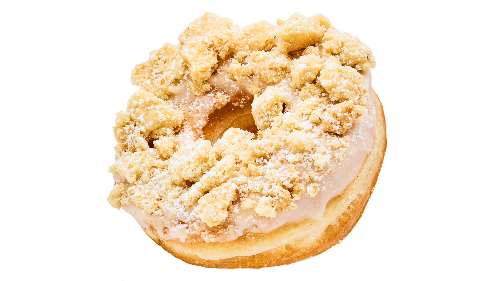 Ein fluffiger, gefüllter Donut mit allem, was nach Winter schmeckt. Innen: eine cremige Orangen-Wintergewürz-Füllung mit Zimt, Muskat und Nelken. Außen: eine frische Orangen-Glasur und eine Schicht weicher Orangenkuchen-Crumble.