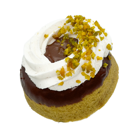 Festlicher geht’s kaum! Ein fluffiger Donut, gefüllt mit Nougat-Pudding und überzogen mit cremiger Nougat-Glasur. Oben drauf: gehackte salzige Pistazien, ein Swirl Pistazien-Sahne und ein Hauch Glitzer.