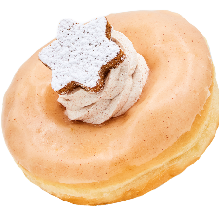 Ein fluffiger Donut mit einer leicht zitronigen Zimtglasur und einem Strudel aus Cream Cheese. Das Highlight: ein süßer Zimtstern-Keks oben drauf. Nur dieses Wochenende erhältlich.