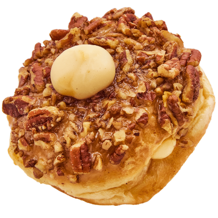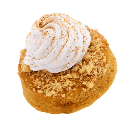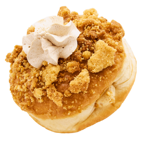 A fluffy donut with autumnal caramel-apple filling at its core. Glazed in sweet caramel, rolled in brown sugar crumble, and finished with a dash of silky caramel whip. Taste like a homemade autumn dessert in donut form.