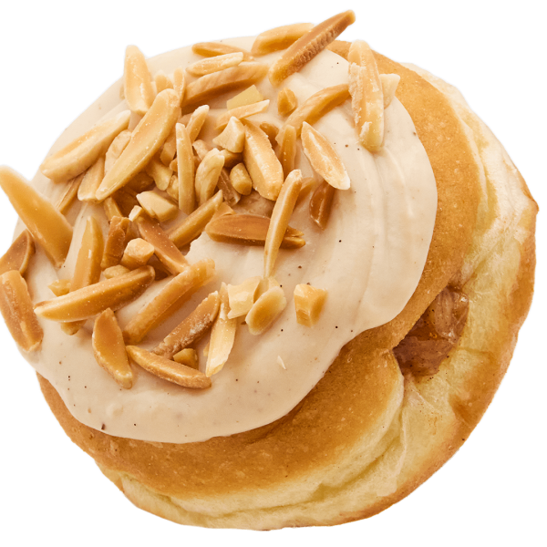 You don’t know Bienenstich yet? Well, ask any German around you and we promise they will start raving about it. This donut is filled with our homemade vanilla custard made with organic vanilla, then dunked in a vanilla glaze, and topped with roasted slivered almonds.