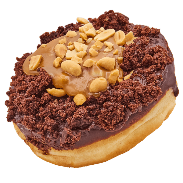 This flavour has the potential to become a regular on our menu, what do you think? A fluffy donut dipped in rich Original Beans ganache, covered in fudgy brownie pieces, and topped with thick peanut caramel and chopped peanuts.
