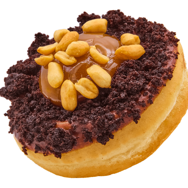 Originally a November monthly special — and one you really didn’t want to see go. This donut was so loved that it’s now back for a three-month run. A soft donut dipped in Original Beans ganache, rolled in fudgy brownie pieces, and filled with thick caramel. Finished with crunchy chopped peanuts for the perfect balance of sweet and salty.