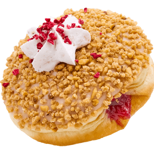 A donut version of the German classic. Filled with housemade raspberry jam, glazed in vanilla, and rolled in crunchy hazelnut praline. Finished with a touch of vanilla whip and freeze-dried raspberries for a fruity finish.