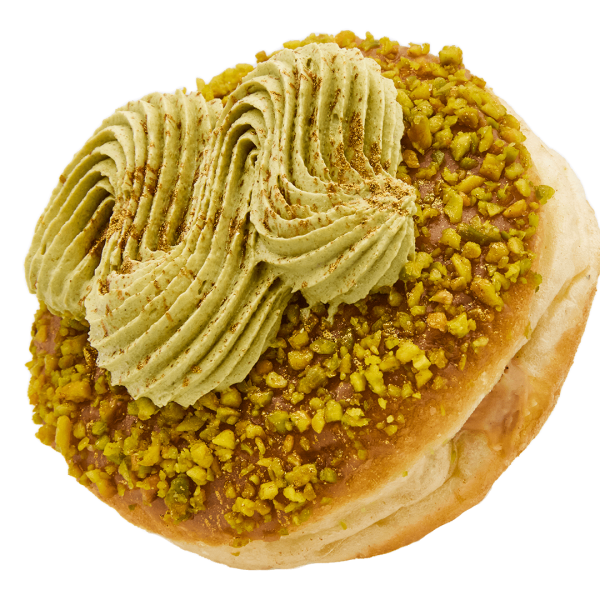 This donut is inspired by our customer Emi, who suggested this delightful flavour during our customer flavour contest. It’s filled with delicious pistachio cream, covered with vanilla glaze, and topped with salted roasted pistachios for the perfect crunch.