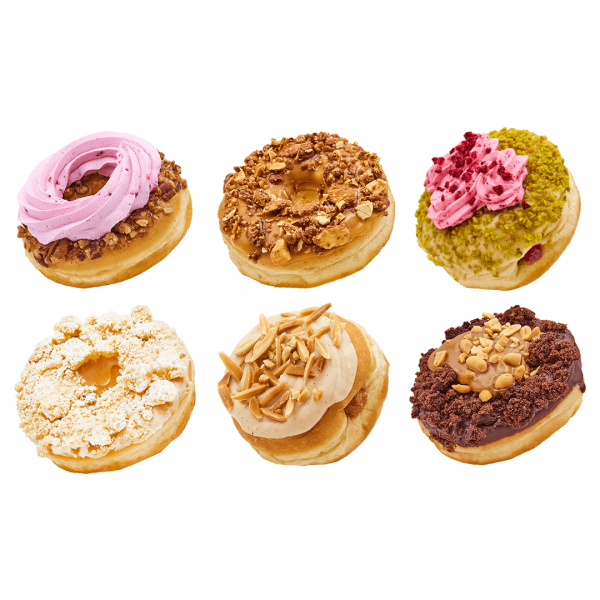 Our seasonal special donuts. This box includes: Blueberry Pecan, Bratapfel, Vanillekipferl, Gebrannte Mandeln, Brownie Caramel Peanut and Raspberry Pistachio.