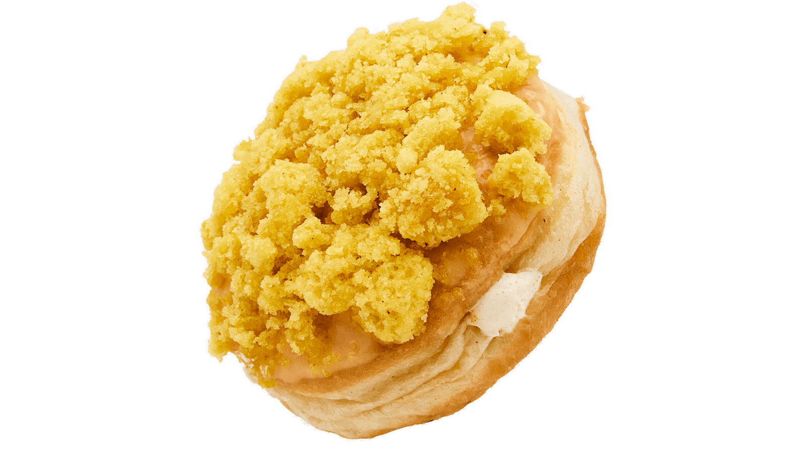 A fluffy filled donut infused with all the flavours of winter. Inside: a creamy orange–winter-spice filling with cinnamon, nutmeg, and cloves. Outside: a bright orange glaze and a coating of soft orange cake crumble. Comforting, citrusy, and perfectly seasonal.