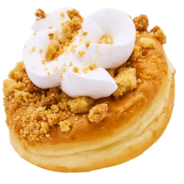 A fluffy donut with autumnal caramel-apple filling at its core. Glazed in sweet caramel, rolled in brown sugar crumble, and finished with a dash of silky caramel whip. Taste like a homemade autumn dessert in donut form.