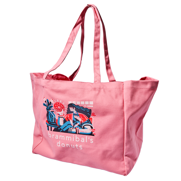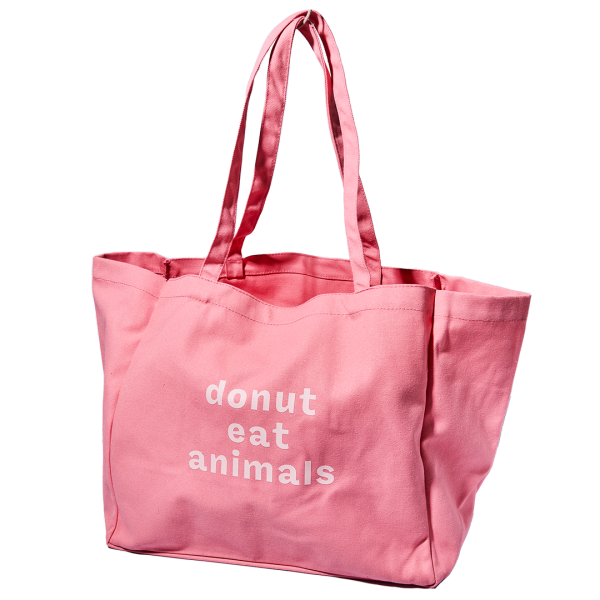 Our signature pink tote – bold, roomy, and ready for all your donut runs. Featuring an exclusive illustrated design by Florian Schommer on one side and our signature ‘donut eat animals’ slogan on the other. With extra-long straps for max comfort.