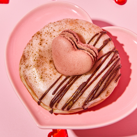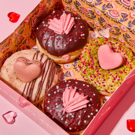 Share the love — or keep it all to yourself. Our limited Valentine’s Box brings together four dreamy donuts made for the sweetest day of the year. Inside you’ll find one Double Choc Macaron, one Pistachio Raspberry Macaron, and two Choc Strawberry Cloud donuts. Think chocolate, fruity berry notes, nutty pistachio, and vegan Macarons. All handmade, all vegan, and all dressed up for Valentine’s Day.