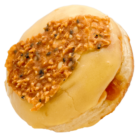 This donut is inspired by our customer Emi, who suggested this delightful flavour during our customer flavour contest. It’s filled with delicious pistachio cream, covered with vanilla glaze, and topped with salted roasted pistachios for the perfect crunch.