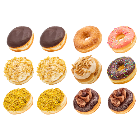 This box is perfect for everyone who want a selection of flavours for a bigger party and don’t want to choose. It contains our all-time favourites: 2x Boston Cream, 2x Bienenstich, 2x Mousse au Chocolate, 2x Pistachio Dream, 1x Bratapfel, 1x Strawberry Sprinkles, 1x Cinnamon Sugar, and 1x Choc Sprinkles